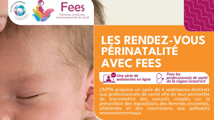 Dans le cadre du projet FEES, l’APPA avec le soutien de l’ARS Grand Est et de la région Grand Est, organise un cycle de 4 webinaires gratuits à destination des professionnels de santé de la région pour les sensibiliser sur la thématique « santé environnementale et périnatalité » et leur présenter le projet FEES.